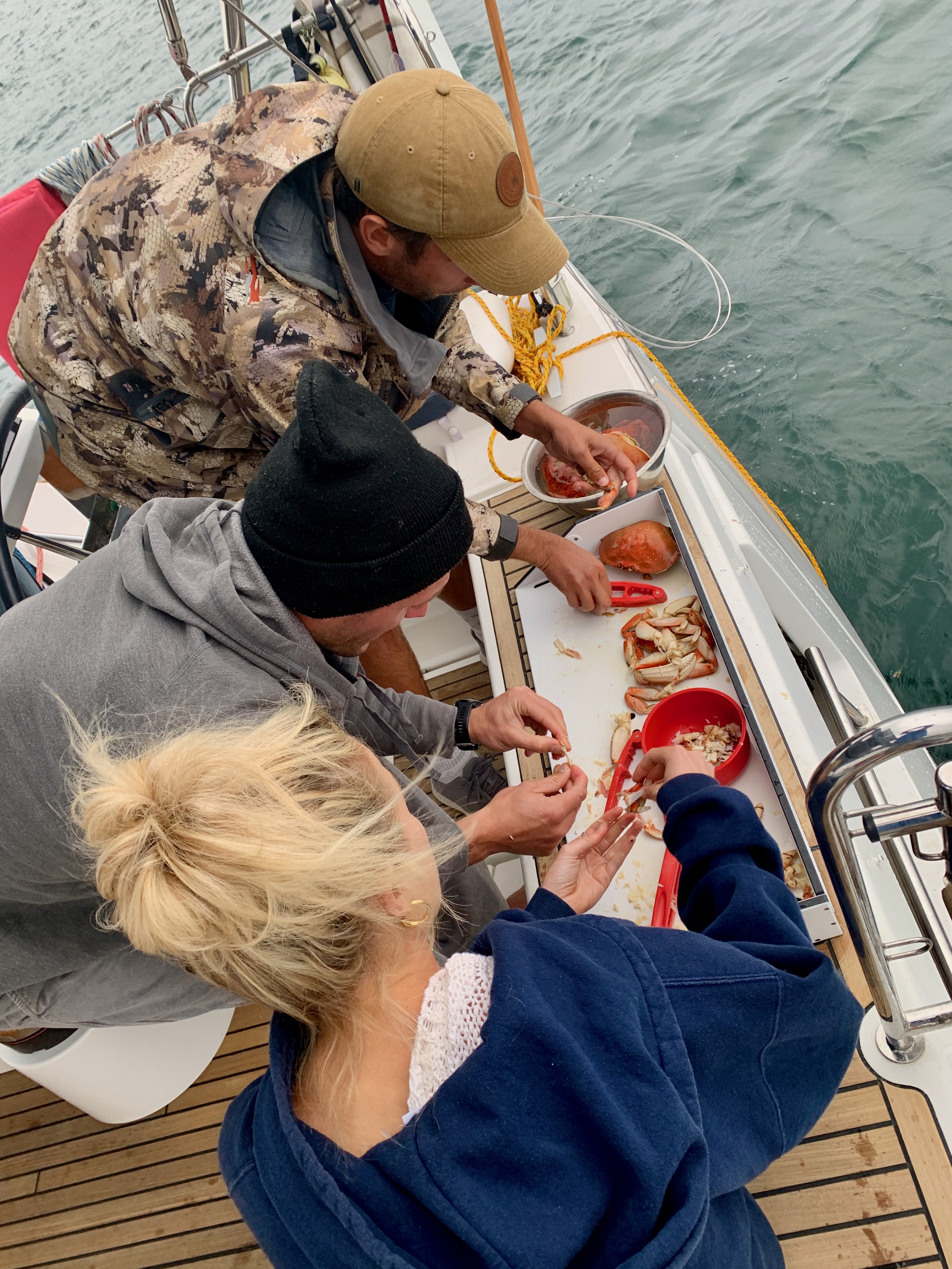 Our skilled crew made the most of the bountiful waters! Thanks to these landlubbers disguised as expert fisher people, we ate like kings! That’s Hannah with a nice sized Ling Cod ( think fish curry with rice and veggies), Max and Matt with the local crab ( think fresh crab cakes and hot parmesan crab dip), and Matt and Max with another beautiful Ling Cod ( think baked cod with garlic and miso)