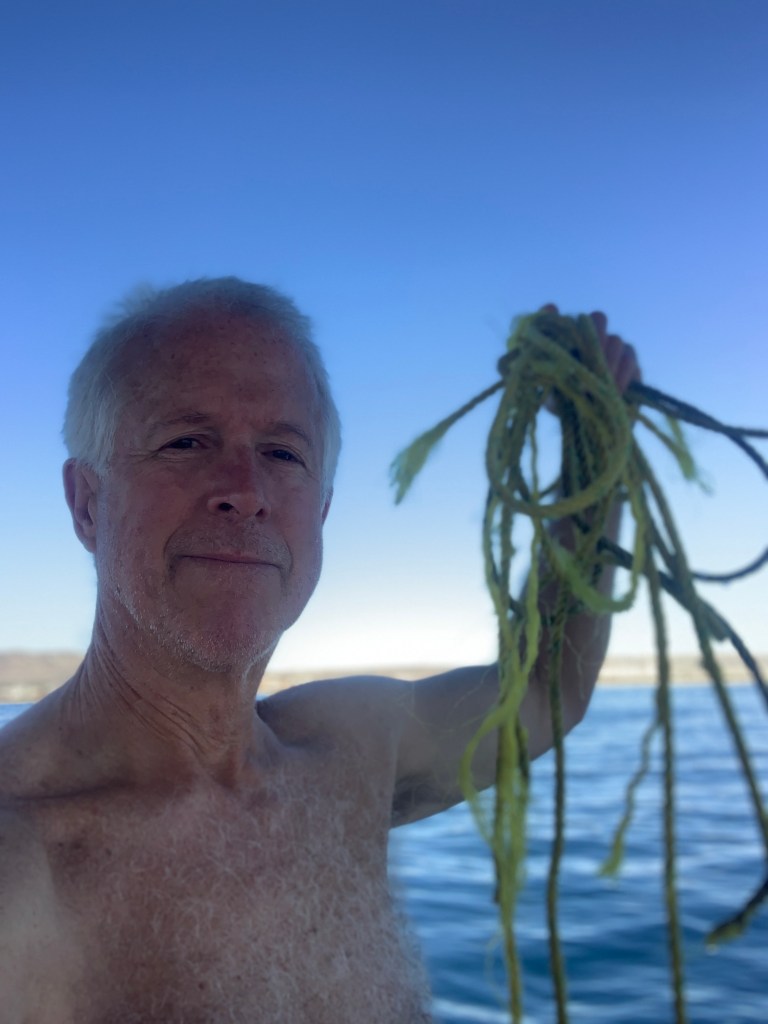 With our usual early departure and ready for an overnight trip, from Colonet we set sail to San Quintin ( pronounced “San Keen Teen”). From San Quintin we headed for Turtle Bay but passed it up the next morning deciding to continue on to Asuncion. We anchored before sunset off the village noticing there was something wrong with our prop when in reverse. Next morning the captain donned a wet suit and dove in to find a yellow nylon line tangled in our prop. Someone’s fish trap now floating free!