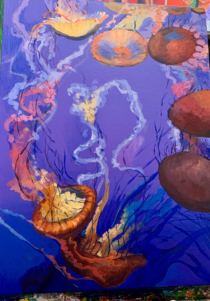 Wandering around the town one day, we ran across a painting studio that offered classes. Katie immediately enrolled in 3 sessions and using a photo taken at the Monterey Bay Aquarium as inspiration, produced her own masterpiece! Let’s face it the teacher was a genius!