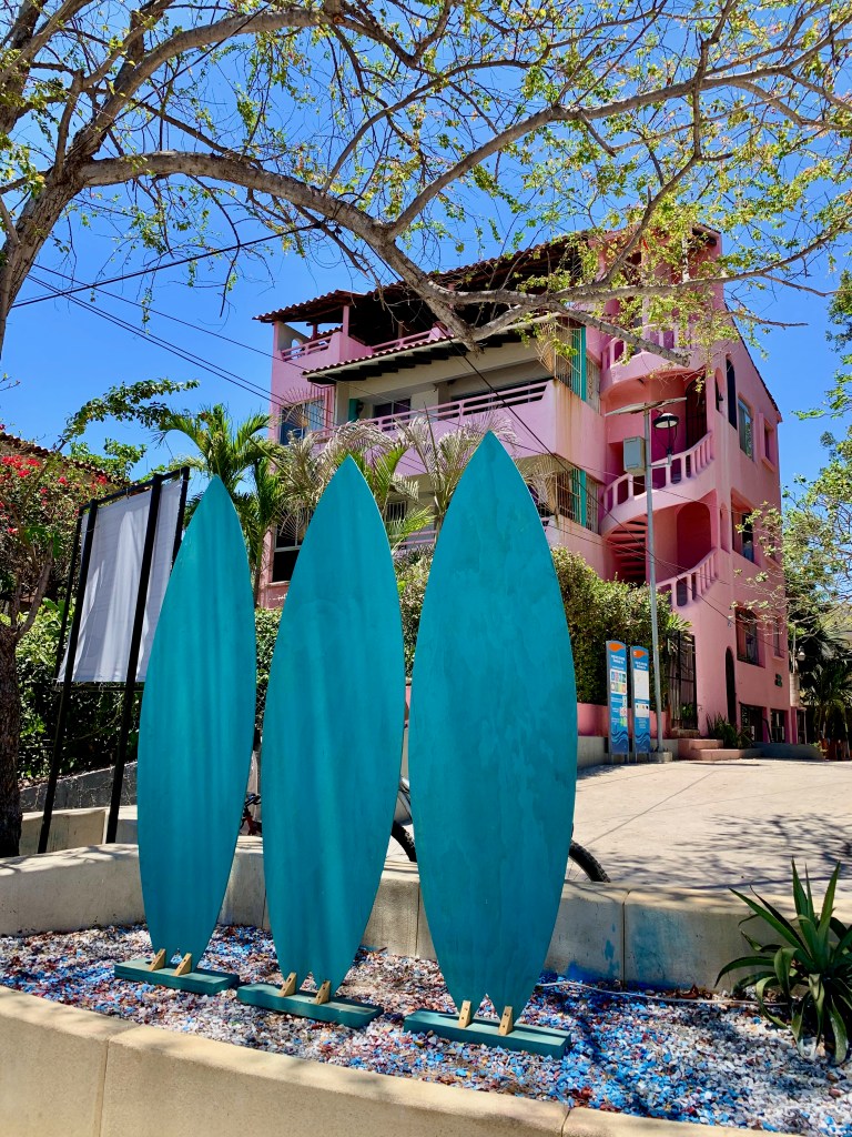 We walked down to the Playa Madera–where there is a whale tale sculpture–for dinner and could see Samsara anchored in the bay.
