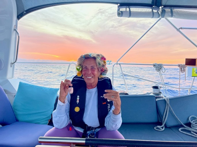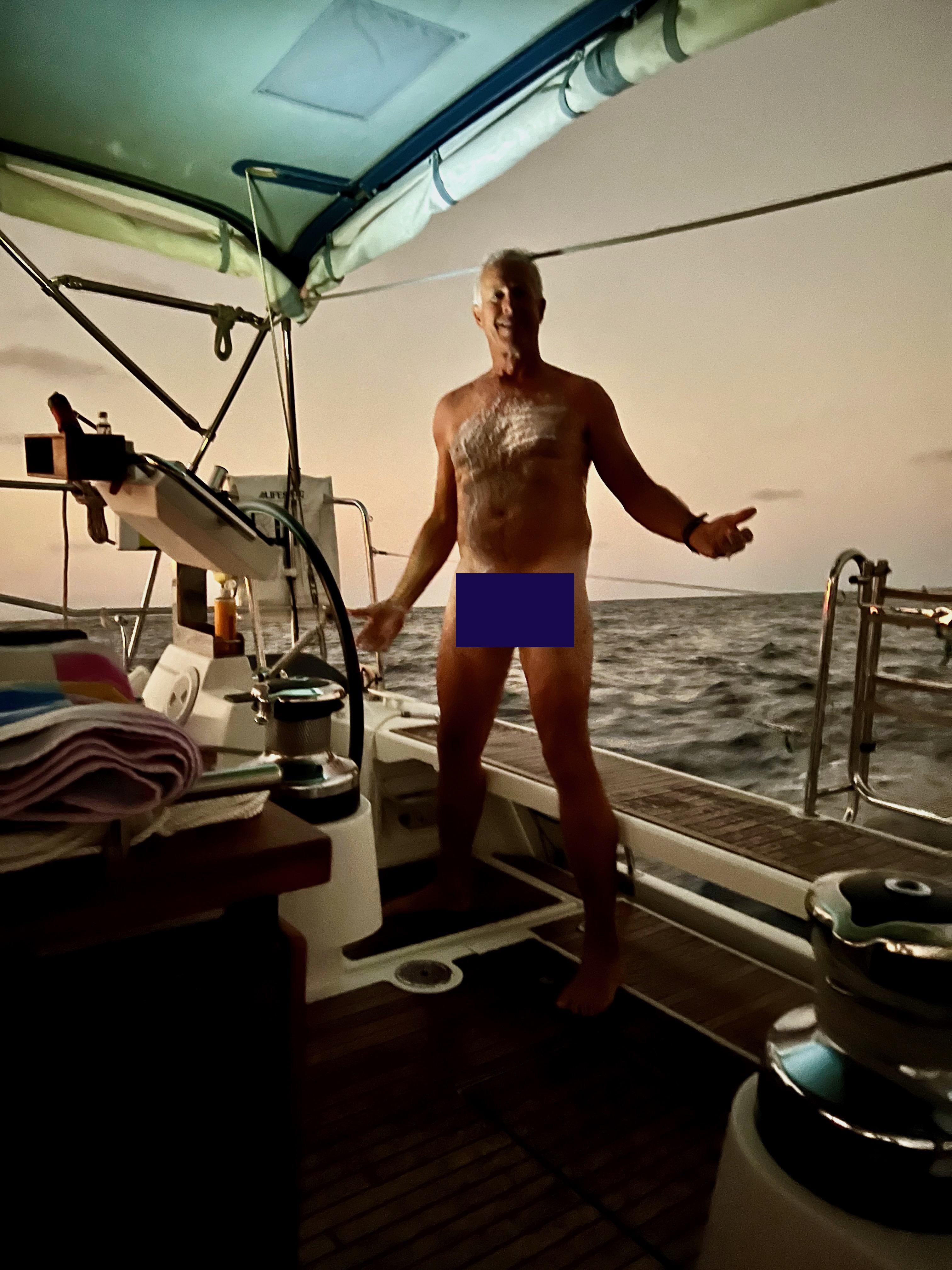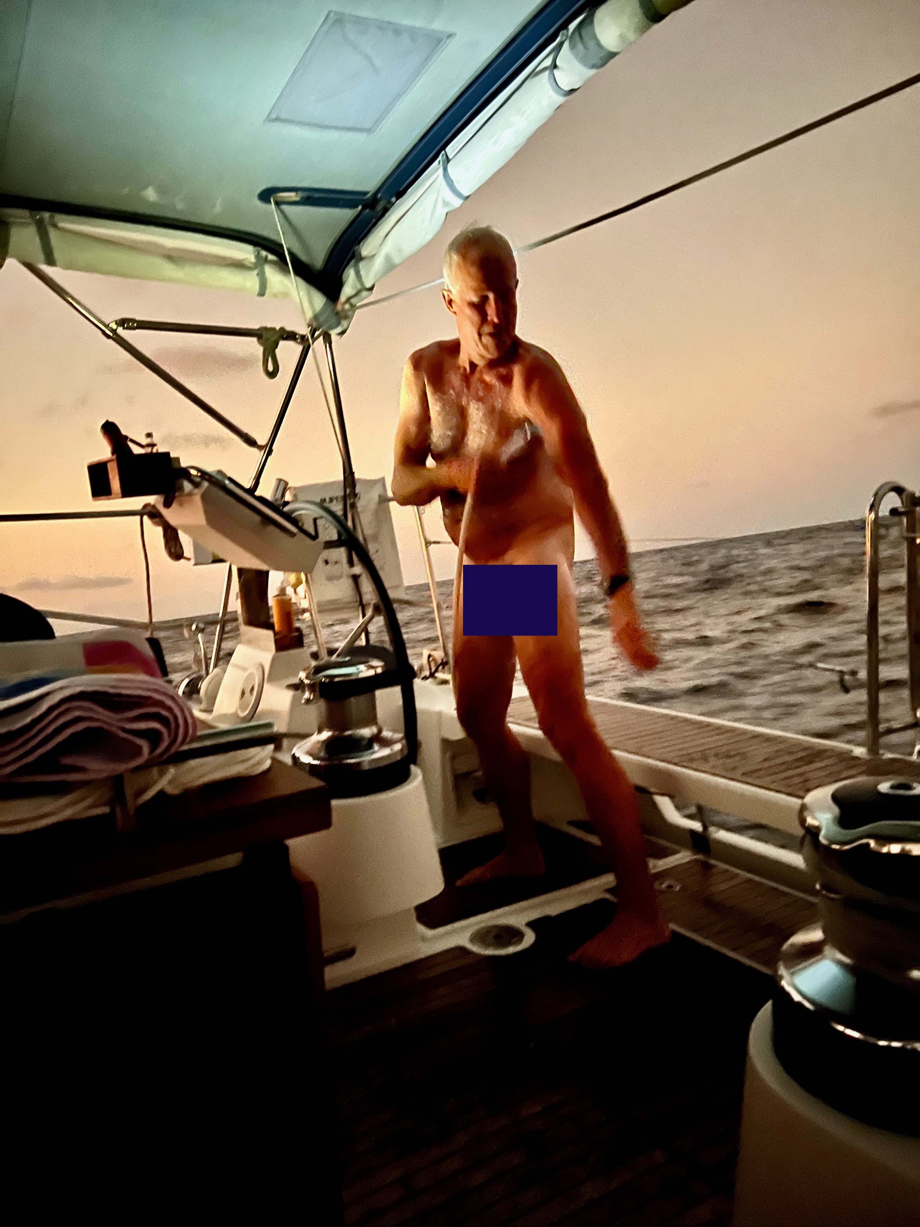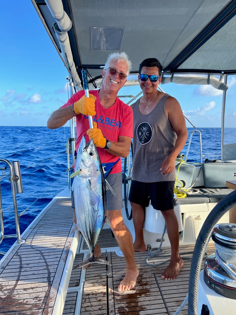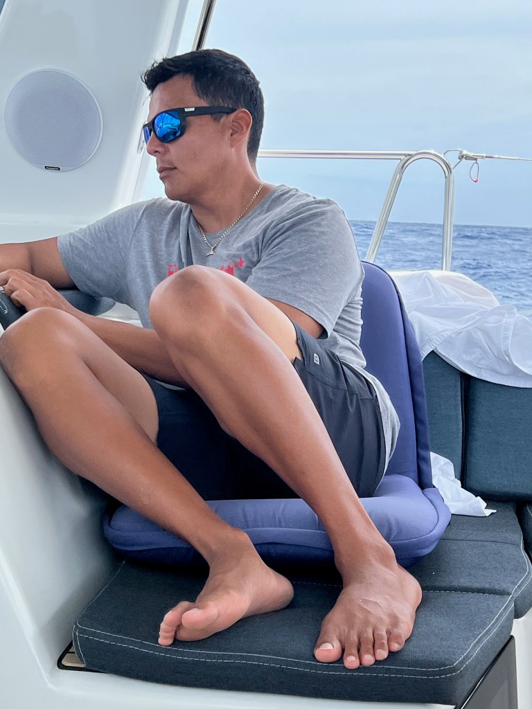 We sailed with the Code 0 for about 24 hours in about 10 kts of wind and it was beautiful. Then, on afternoon of the 5th day, we heard a pop, which was the swivel block at the head of the sail exploding. With surprise and dismay , we watched as the sail drifted down and under our hull as Samsara continued forward powered by the main sail. It took about an hour to get it all back on board and may not have happened if Carlos wasn’t there to help. I would have had to just cut the lines and let it go….