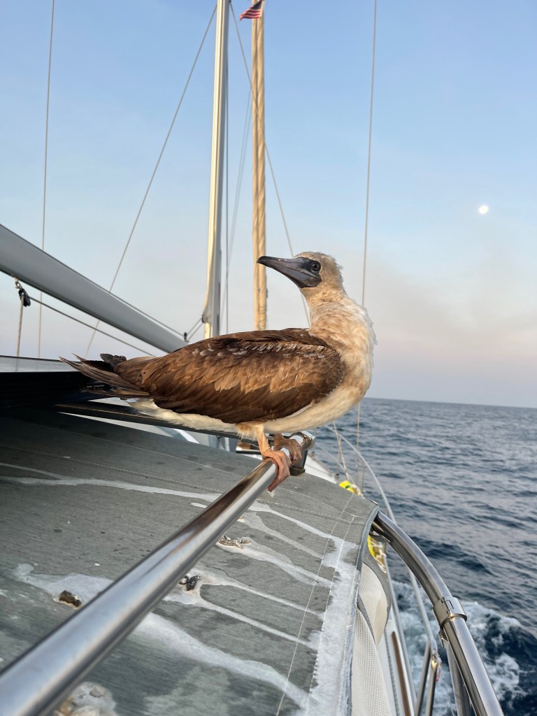 Oddly we saw Boobies throughout the passage. We often wondered where they rested beside on the few transiting boats. As the winds died down, they landed on Samsara. The can make a stinky mess in no time at all!