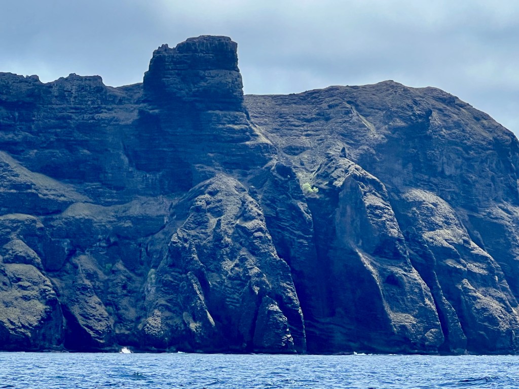 After rounding the SE end of Ua Huka we finally closed in on Nuku Hiva. The cliffs look like carved chess pieces! After 19 days at sea we finally motored into Taiohae Bay seeing our friends Nan & Doug on Paseo for the first time in about a year, though we had been tracking their progress on Predictwind and reading their well written and entertaining posts.